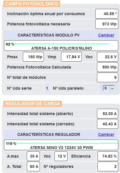 Indicaremos un voltaje de producción de 12 voltios, con lo que la potencia fotovoltaica necesaria es de 973 watios pico. Elegimos el modelo de panel policristalino de ATERSA A-150 de 12 V y, montando 6 paneles, obtenemos 900 watios pico (92% de lo previsto inicialmente), que se da por aceptable.